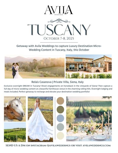 Getaway with us to capture incredible micro-wedding content at a private estate in the romantic vineyard hills of Siena, Italy. Attract your ideal destination wedding clients with sweeping vineyards on horseback, the charm of the Tuscan countryside, and your wedding portfolio experience in Italy!! Clients will be blown away with the incredible vision of the romance here that they dream of! Overnight accommodations and 3 meals included. Airfare is not included.